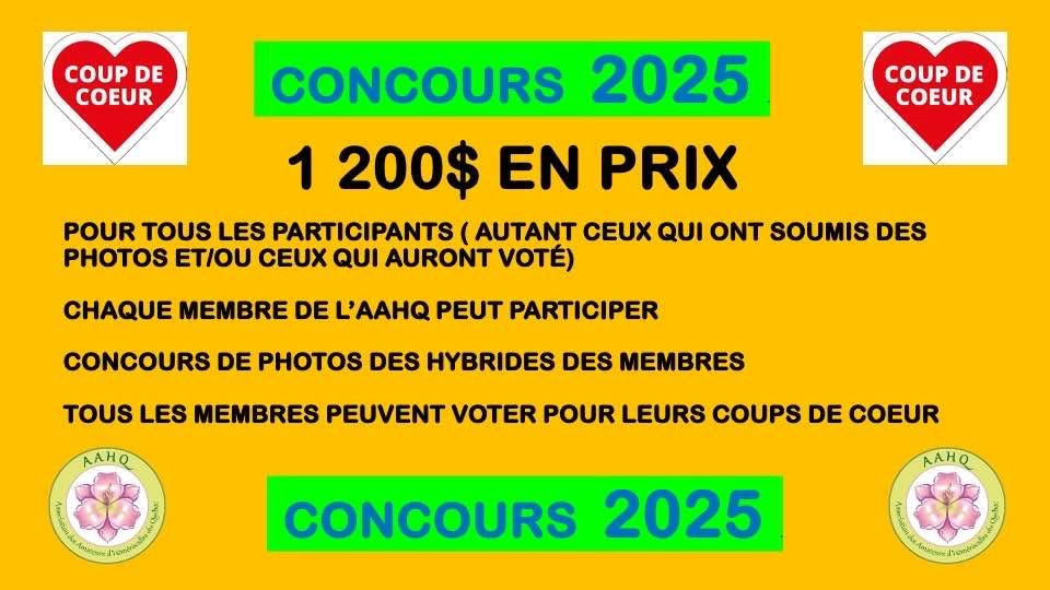 Nous sommes heureux de vous annoncer les détails de notre fameux concours annuel Coup de cœur, cette belle vitrine sur les résultats du travail de nos hybrideurs-membres. Encore cette année, ce concours sera le point culminant de notre « Hémérobrunch » printanier. Nous vous rappelons que ce concours s’adresse à tous les membres en règle qui voudront soumettre des photos et/ou voter pour les fleurs de leur choix.